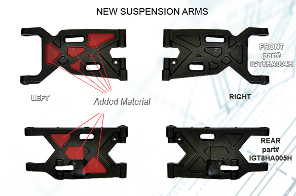 After improving the harder plastic suspension arms in the IGT8 Red we have now taken it a step further. A solid arm now has less flex to increase response of the car.