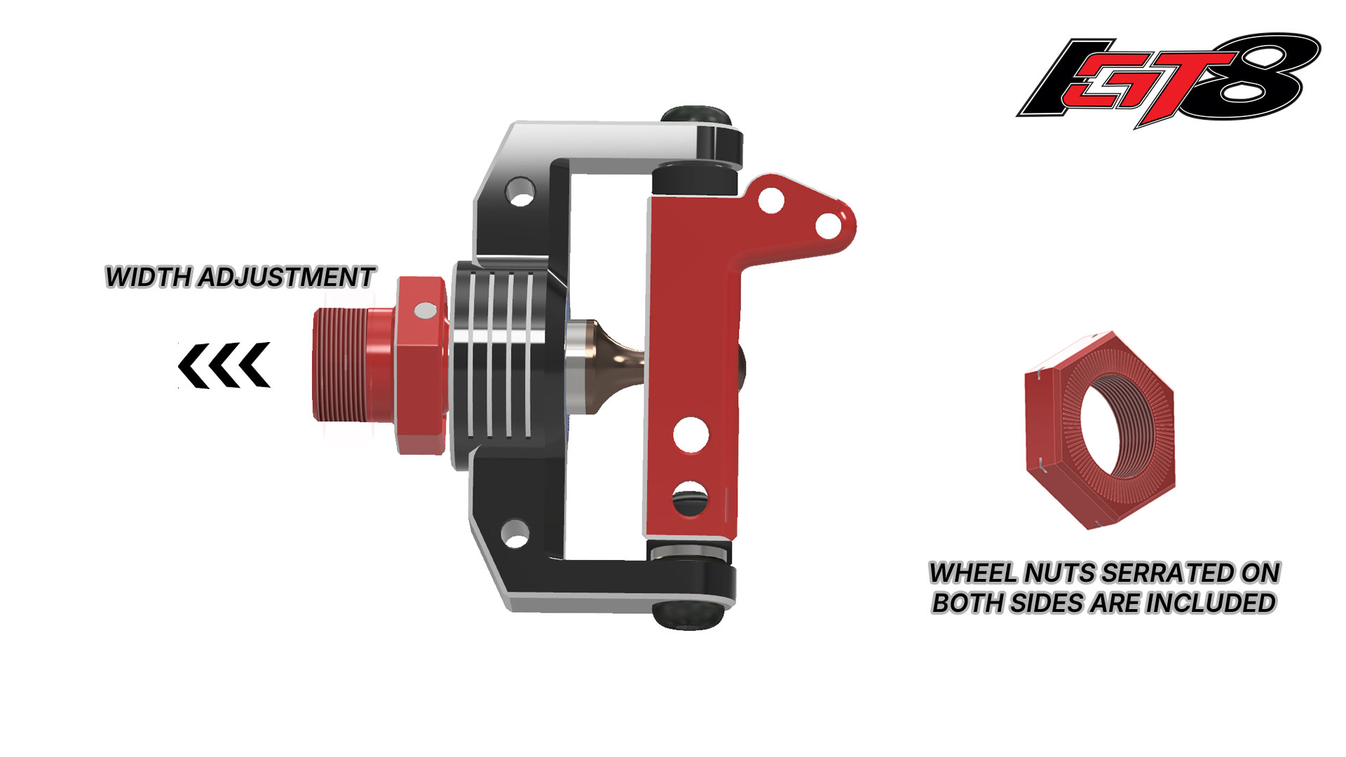 Another gem is the lightweight wheel hexes. We were able to give a simple component like this a very versatile and smart application. The SYM already has all the options needed to change the car's width. You don’t need to purchase different hex options anymore, but by simply moving spacers, you can adjust your width for up to 2mm per side. Another cool thing is the wheel nuts. They are serrated on both sides.