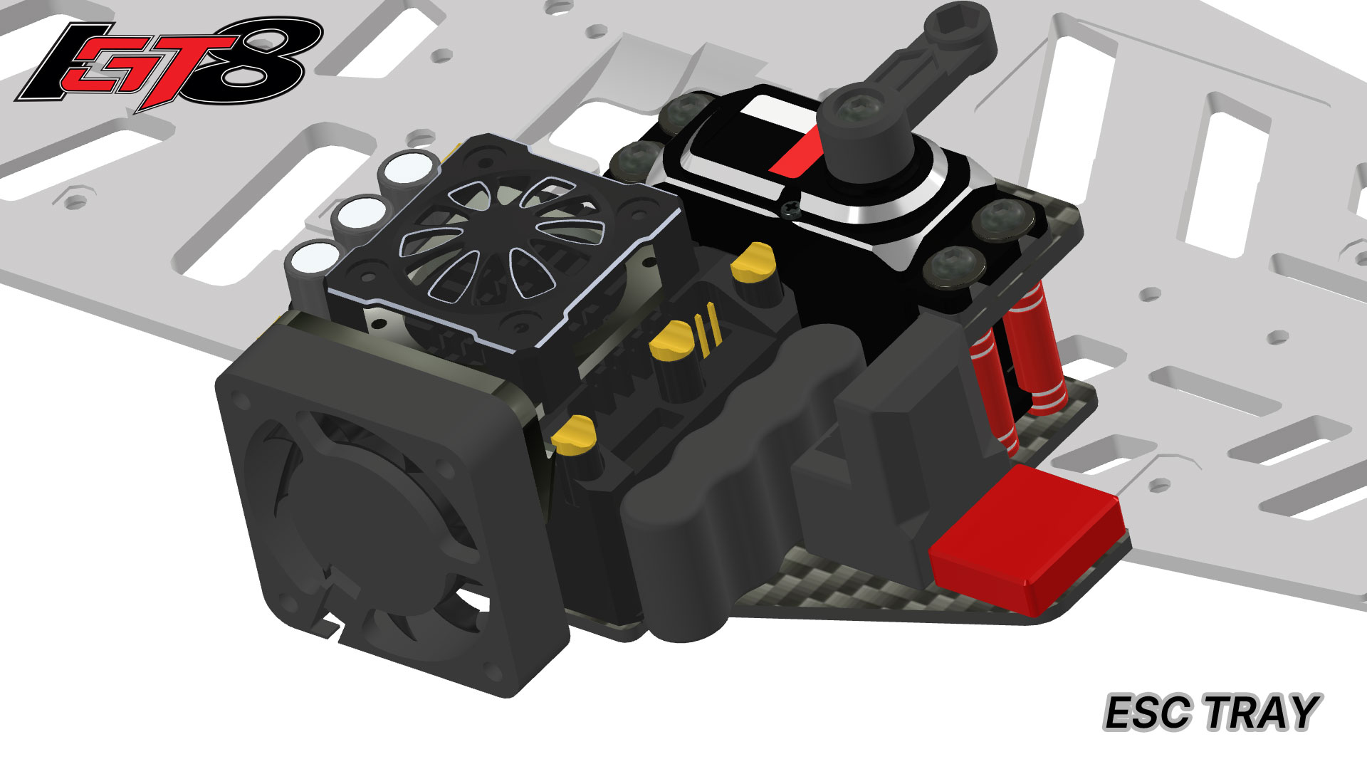 The ESC is mounted on a carbon fiber base. Slots under the ESC have been added to allow airflow. The trays also house the receiver and the transponder. An optional purposed built 40mm stylish cooling fan support is also available.