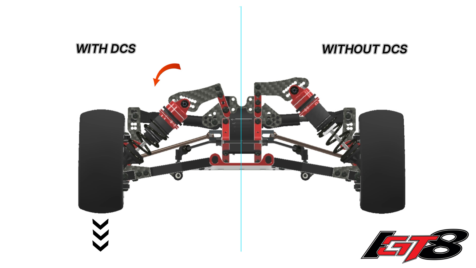 The DCS can be activated by removing 2 screws on the fly and the action is independent for the front and rear suspension. When activated it ensures optimal wheel contact by drastically accelerating the rebound of your suspension. This is especially useful in both axles when running on bumpy tracks, or in the rear when more steering is needed under braking.