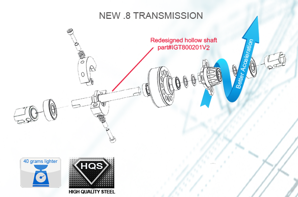 Available as an optional in our previous car, the IGT8 Red, the .8 transmission has proven to be a great success, improving not only acceleration but being a bullet proof transmission with very little maintenance which seems to be a common problem for most GT cars. This upgraded transmission also remains more consistent during the long runs and is 50 grams lighter than the previous one.